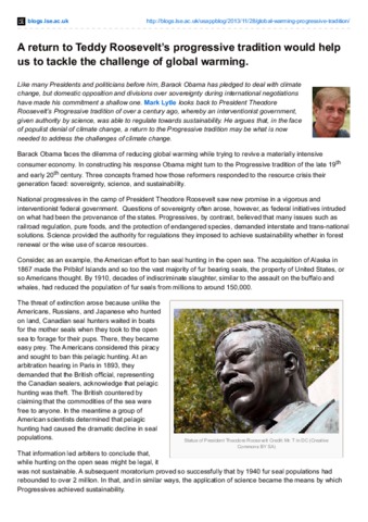 Like many Presidents and politicians before him, Barack Obama has pledged to deal with climate change, but domestic opposition and divisions over sovereignty during international negotiations have made his commitment a shallow one. Mark Lytle looks back to President Theodore Roosevelt’s Progressive tradition of over a century ago, whereby an interventionist government, given authority by science, was able to regulate towards sustainability. He argues that, in the face of populist denial of climate change, a return to the Progressive tradition may be what is now needed to address the challenges of climate change.