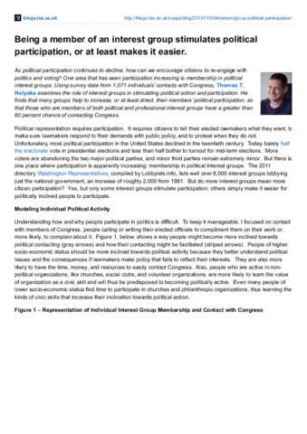 As political participation continues to decline, how can we encourage citizens to re-engage with politics and voting? One area that has seen participation increasing is membership in political interest groups. Using survey data from 1,071 individuals’ contacts with Congress, Thomas T. Holyoke examines the role of interest groups in stimulating political action and participation. He finds that many groups help to increase, or at least direct, their members’ political participation, so that those who are members of both political and professional interest groups have a greater than 60 percent chance of contacting Congress.