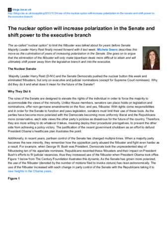 The so-called “nuclear option” to limit the filibuster was talked about for years before Senate Majority Leader Harry Reid finally moved forward with it last week. Michele Swers describes this move as the culmination of years of increasing polarization in the Senate. She goes on to argue that the elimination of the filibuster will only make bipartisan deals more difficult to attain and will ultimately shift power away from the legislative branch and into the executive.