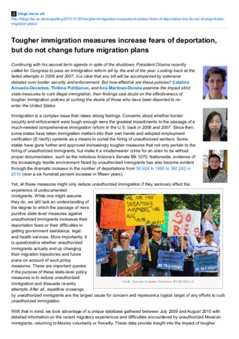 Continuing with his second term agenda in spite of the shutdown, President Obama recently called for Congress to pass an immigration reform bill by the end of the year. Looking back at the failed attempts in 2006 and 2007, it is clear that any bill will be accompanied by extensive debates over border security and enforcement. But how effective are these policies? Catalina Amuedo-Dorantes, Thitima Puttitanun, and Ana Martinez-Donate examine the impact strict state measures to curb illegal immigration; their findings cast doubt on the effectiveness of tougher immigration policies at curbing the desire of those who have been deported to re-enter the United States.