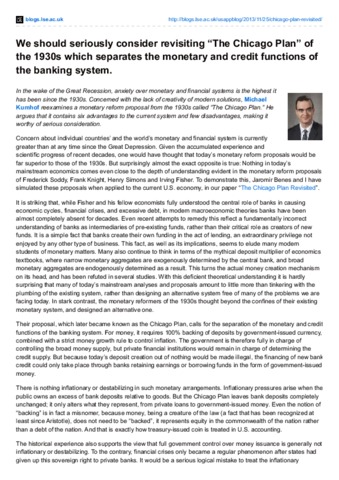In the wake of the Great Recession, anxiety over monetary and financial systems is the highest it has been since the 1930s. Concerned with the lack of creativity of modern solutions, Michael Kumhof reexamines a monetary reform proposal from the 1930s called “The Chicago Plan.” He argues that it contains six advantages to the current system and few disadvantages, making it worthy of serious consideration.