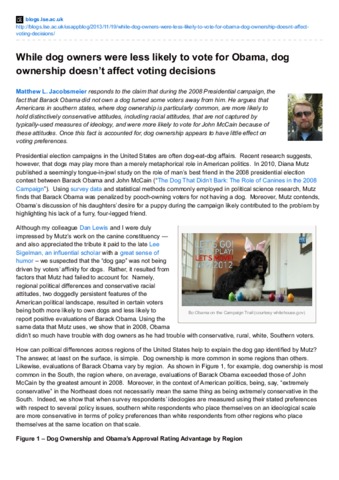 Matthew L. Jacobsmeier responds to the claim that during the 2008 Presidential campaign, the fact that Barack Obama did not own a dog turned some voters away from him. He argues that Americans in southern states, where dog ownership is particularly common, are more likely to hold distinctively conservative attitudes, including racial attitudes, that are not captured by typically-used measures of ideology, and were more likely to vote for John McCain because of these attitudes. Once this fact is accounted for, dog ownership appears to have little effect on voting preferences.