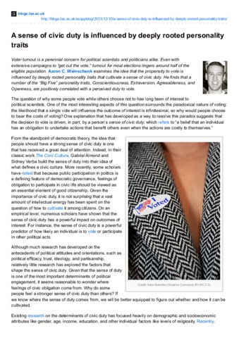 A sense of civic duty is influenced by deeply rooted personality traits.