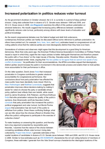 As the government shutdown in October showed, the U.S. is currently in a period of deep political division. Using data collected from in dozens of U.S. Senate races between 1996 and 2006, and 50 U.S. House races in 2006, Jon Rogowski examines the effect of this partisan polarization on electoral behaviors. His results suggest that increasing policy differences between candidates significantly reduces voter turnout, particularly among citizens with lower levels of education and political knowledge.