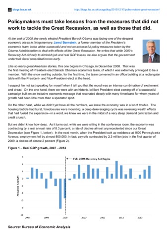 At the end of 2008, the newly elected President Barack Obama was facing one of the deepest economic crises in living memory. Jared Bernstein, a former member of the President’s economic team, looks at the successful and not-so-successful policy measures taken by the Obama Administration to deal with effects of the Great Recession. He writes that while 2009’s Recovery Act did help to diminish job and real GDP losses, he also argues that the government undertook fiscal consolidation too early.