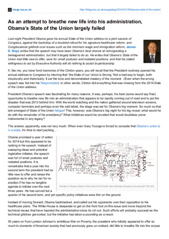 Last night President Obama gave his annual State of the Union address to a joint session of Congress, against the backdrop of a troubled rollout for his signature healthcare reform, and Congressional gridlock over issues such as the minimum wage and immigration reform. James D. Boys writes that the speech may have been Obama’s best chance at reinvigorating a beleaguered administration, but that it largely failed to do so. He writes that Obama’s State of the Union had little new to offer, save for small postures and restated positions, and that his stated willingness to act by Executive Authority will do nothing to assist bi-partisanship.