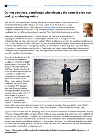 With the 2014 mid-term elections looming ever closer, it is only a matter of time before the calls for candidates to have greater dialogue on issues begins. But is this dialogue, or ‘issue convergence’ helpful for voters? New research by Keena Lipsitz into what happens when candidates address the same issues at the same time finds that individuals hear from both candidates, they are often easily confused, especially if their level of political interest is not high.