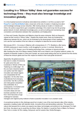 In a time of global economic turbulence what determines whether or not firms succeed or fail? Peng-Fei Li and Harald Bathelt take a close look at the role of clusters in fostering innovation and knowledge exchange across industries. After looking closely at clusters in Canada and China, the authors argue that to gain competitive advantage, firms need to tap into the growing global network of small, distributed knowledge pools, as well as building and maintaining close connections and interactions between their subsidiaries and headquarters.