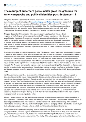 The years after 2001’s September 11 terrorist attacks have seen revived interest in the fictional superhero genre, most noticeably in film. Annika Hagley and Michael Harrison take a close look at one of the most popular and successful iterations of this genre, Marvel Comics’ Avengers’ series. They write that each character in the multi-billion dollar film franchise represents a distinct identity or behavior with which the United States has been struggling to reconcile itself, while collectively the film series represents the reactions of a nation to a direct, domestic attack.