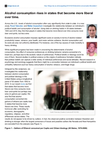 Across the U.S., levels of alcohol consumption often vary significantly from state to state. In a new study, Pavel Yakovlev and Walter Guessford investigate the relationship between an individual’s political beliefs and consumption of alcohol. Using data on drinking habits in 50 states between 1952 and 2010, they find that people in states that become more liberal over time consume more beer and spirits, but less wine.