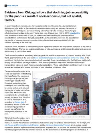 In recent decades, America’s cities have experienced a trend towards the suburbanization of housing and jobs, whilst at the same time, economic restructuring has reduced the number of well-paying low-skilled jobs, and caused rising rates of poverty. But how have these changes affected job opportunities for the poor? Using data from Chicago from 1990 to 2010, Lingqian Hu finds that the suburbanization of poor job seekers and their matching job opportunities has benefited them and improved their job accessibility. At the same time, however, the reductions in the number of relevant jobs and increasing poverty levels have adversely affected poor job seekers, especially in the inner city.