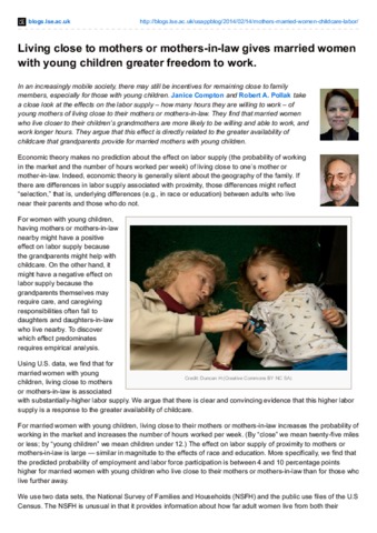 In an increasingly mobile society, there may still be incentives for remaining close to family members, especially for those with young children. Janice Compton and Robert A. Pollak take a close look at the effects on the labor supply – how many hours they are willing to work – of young mothers of living close to their mothers or mothers-in-law. They find that married women who live closer to their children’s grandmothers are more likely to be willing and able to work, and work longer hours. They argue that this effect is directly related to the greater availability of childcare that grandparents provide for married mothers with young children.