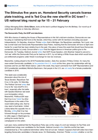 The Stimulus five years on, Homeland Security cancels license plate tracking, and is Ted Cruz the new sheriff in DC town? – US national blog round up for 15 – 21 February