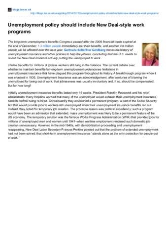 The long-term unemployment benefits Congress passed after the 2008 financial crash expired at the end of December; 1.3 million people immediately lost their benefits, and another 4.9 million people will be affected over the next year. Gertrude Schaffner Goldberg traces the history of unemployment insurance and other policies to help the jobless, concluding that the U.S. needs to revisit the New Deal model of actively putting the unemployed to work.