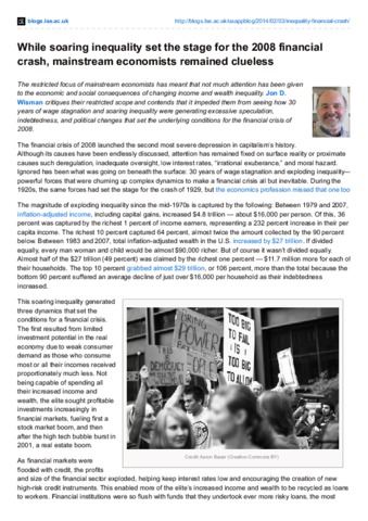 The restricted focus of mainstream economists has meant that not much attention has been given to the economic and social consequences of changing income and wealth inequality. Jon D. Wisman critiques their restricted scope and contends that it impeded them from seeing how 30 years of wage stagnation and soaring inequality were generating excessive speculation, indebtedness, and political changes that set the underlying conditions for the financial crisis of 2008.