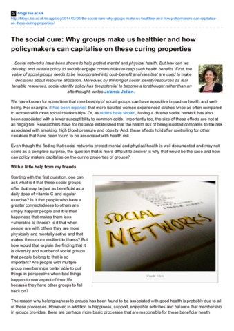 The social cure: Why groups make us healthier and how policymakers can capitalise on these curing properties.