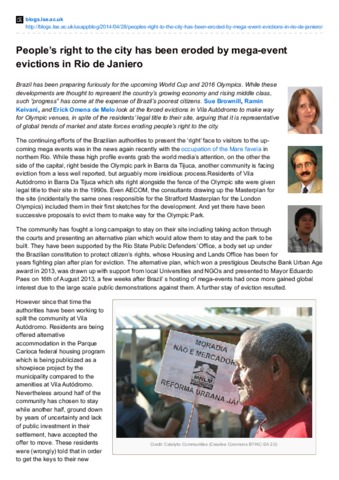 Brazil has been preparing furiously for the upcoming World Cup and 2016 Olympics. While these developments are thought to represent the country’s growing economy and rising middle class, such “progress” has come at the expense of Brazil’s poorest citizens. Sue Brownill, Ramin Keivani, and Erick Omena de Melo look at the forced evictions in Vila Autódromo to make way for Olympic venues, in spite of the residents’ legal title to their site, arguing that it is representative of global trends of market and state forces eroding people’s right to the city.
