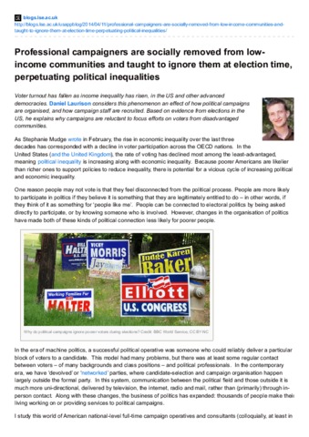 Voter turnout has fallen as income inequality has risen, in the US and other advanced democracies. Daniel Laurison considers this phenomenon an effect of how political campaigns are organised, and how campaign staff are recruited. Based on evidence from elections in the US, he explains why campaigns are reluctant to focus efforts on voters from disadvantaged communities.