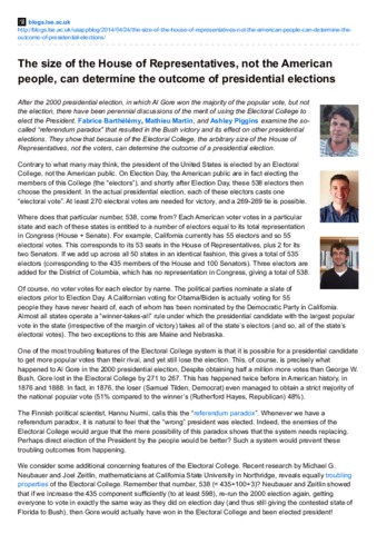 After the 2000 presidential election, in which Al Gore won the majority of the popular vote, but not the election, there have been perennial discussions of the merit of using the Electoral College to elect the President. Fabrice Barthélémy, Mathieu Martin, and Ashley Piggins examine the so-called “referendum paradox” that resulted in the Bush victory and its effect on other presidential elections. They show that because of the Electoral College, the arbitrary size of the House of Representatives, not the voters, can determine the outcome of a presidential election.