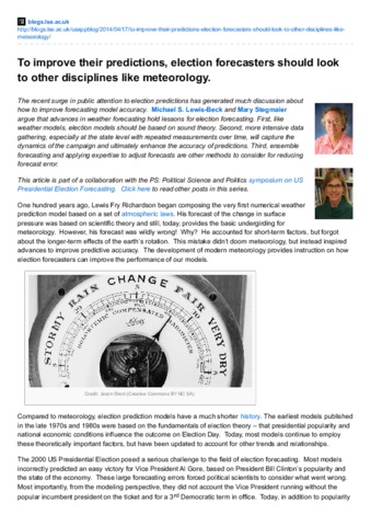 The recent surge in public attention to election predictions has generated much discussion about how to improve forecasting model accuracy. Michael S. Lewis-Beck and Mary Stegmaier argue that advances in weather forecasting hold lessons for election forecasting. First, like weather models, election models should be based on sound theory. Second, more intensive data gathering, especially at the state level with repeated measurements over time, will capture the dynamics of the campaign and ultimately enhance the accuracy of predictions. Third, ensemble forecasting and applying expertise to adjust forecasts are other methods to consider for reducing forecast error.