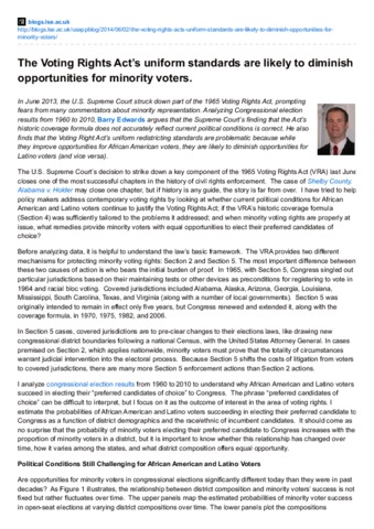 In June 2013, the U.S. Supreme Court struck down part of the 1965 Voting Rights Act, prompting fears from many commentators about minority representation. Analyzing Congressional election results from 1960 to 2010, Barry Edwards argues that the Supreme Court’s finding that the Act’s historic coverage formula does not accurately reflect current political conditions is correct. He also finds that the Voting Right Act’s uniform redistricting standards are problematic because while they improve opportunities for African American voters, they are likely to diminish opportunities for Latino voters (and vice versa).