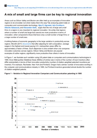 Areas such as Silicon Valley and Boston are often held up as examples of innovative regions to be emulated, but what makes them this way? By analysing patent data on computers and communication technology, Ajay K. Agrawal, Iain Cockburn, Alberto Galasso, and Alexander Oettl, argue that the mix of large and small firms in a region is very important to regional innovation. He writes that regions where a number of small and large lists coexist are more productive in terms of innovation, when compared to those that have only a small number of large firms or a large number of small ones.