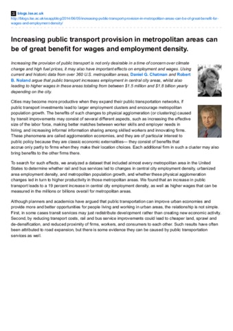 Increasing the provision of public transport is not only desirable in a time of concern over climate change and high fuel prices, it may also have important effects on employment and wages. Using current and historic data from over 360 U.S. metropolitan areas, Daniel G. Chatman and Robert B. Noland argue that public transport increases employment in central city areas, whilst also leading to higher wages in these areas totaling from between $1.5 million and $1.8 billion yearly depending on the city.
