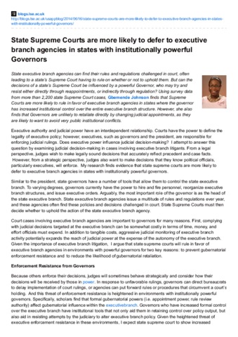 State executive branch agencies can find their rules and regulations challenged in court, often leading to a state’s Supreme Court having to rule on whether or not to uphold them. But can the decisions of a state’s Supreme Court be influenced by a powerful Governor, who may try and resist either directly through reappointments, or indirectly through regulation? Using survey data from more than 2,200 state Supreme Court cases, Gbemende Johnson finds that Supreme Courts are more likely to rule in favor of executive branch agencies in states where the governor has increased institutional control over the entire executive branch structure. However, she also finds that Governors are unlikely to retaliate directly by changing judicial appointments, as they are likely to want to avoid very public institutional conflicts.