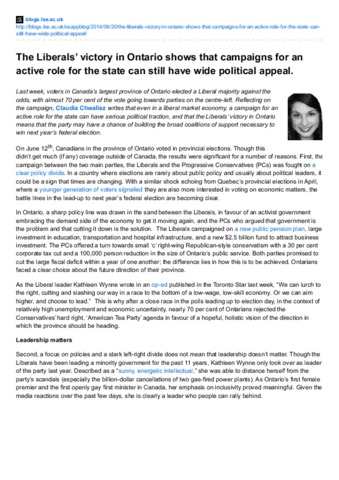 Last week, voters in Canada’s largest province of Ontario elected a Liberal majority against the odds, with almost 70 per cent of the vote going towards parties on the centre-left. Reflecting on the campaign, Claudia Chwalisz writes that even in a liberal market economy, a campaign for an active role for the state can have serious political traction, and that the Liberals’ victory in Ontario means that the party may have a chance of building the broad coalitions of support necessary to win next year’s federal election.
