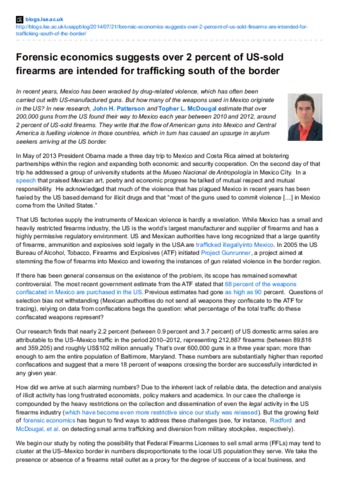 In recent years, Mexico has been wracked by drug-related violence, which has often been carried out with US-manufactured guns. But how many of the weapons used in Mexico originate in the US? In new research, John H. Patterson and Topher L. McDougal estimate that over 200,000 guns from the US found their way to Mexico each year between 2010 and 2012, around 2 percent of US-sold firearms. They write that the flow of American guns into Mexico and Central America is fuelling violence in those countries, which in turn has caused an upsurge in asylum seekers arriving at the US border.