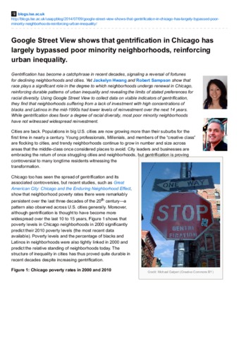 Gentrification has become a catchphrase in recent decades, signaling a reversal of fortunes for declining neighborhoods and cities. Yet Jackelyn Hwang and Robert Sampson show that race plays a significant role in the degree to which neighborhoods undergo renewal in Chicago, reinforcing durable patterns of urban inequality and revealing the limits of stated preferences for racial diversity. Using Google Street View to collect data on visible indicators of gentrification, they find that neighborhoods suffering from a lack of investment with high concentrations of blacks and Latinos in the mid-1990s had lower levels of reinvestment over the next 14 years. While gentrification does favor a degree of racial diversity, most poor minority neighborhoods have not witnessed widespread reinvestment.