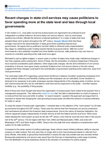 In the modern U.S., most state civil service bureaucracies are organized to be professional and independent of political influence. But have these civil service reforms, such as merit based apolitical recruitment, affected the behavior of elected politicians? In a study of states that have adopted these merit systems throughout the 20th century, Gergely Ujhelyi finds that these changes have led to the decentralization of state government spending towards local governments. He argues that as politicians lost their ability to influence policy implementation, they began to redistribute public funding towards friendly local governments. With the current trend towards a less politically insulated and more flexible civil service, state politicians may now have an incentive to centralize spending at the state level once again.