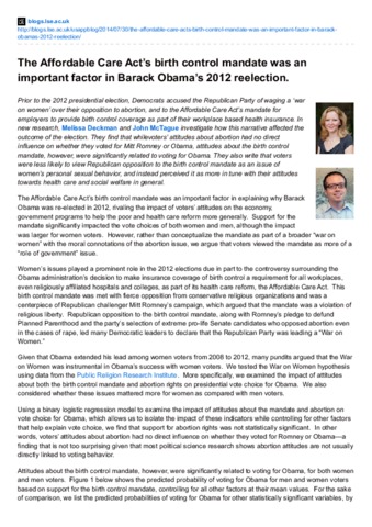 Prior to the 2012 presidential election, Democrats accused the Republican Party of waging a ‘war on women’ over their opposition to abortion, and to the Affordable Care Act’s mandate for employers to provide birth control coverage as part of their workplace based health insurance. In new research, Melissa Deckman and John McTague investigate how this narrative affected the outcome of the election. They find that whilevoters’ attitudes about abortion had no direct influence on whether they voted for Mitt Romney or Obama, attitudes about the birth control mandate, however, were significantly related to voting for Obama. They also write that voters were less likely to view Republican opposition to the birth control mandate as an issue of women’s personal sexual behavior, and instead perceived it as more in tune with their attitudes towards health care and social welfare in general.