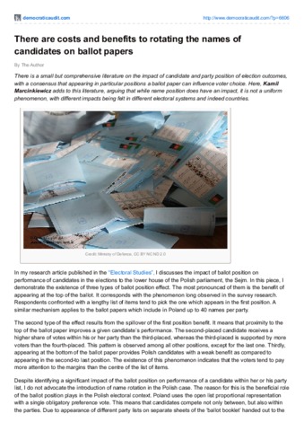 There is a small but comprehensive literature on the impact of candidate and party position of election outcomes, with a consensus that appearing in particular positions a ballot paper can influence voter choice. Here, Kamil Marcinkiewicz adds to this literature, arguing that while name position does have an impact, it is not a uniform phenomenon, with different impacts being felt in different electoral systems and indeed countries.