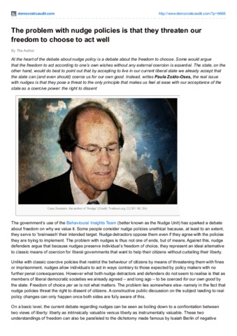 The problem with nudge policies is that they threaten our freedom to choose to act well