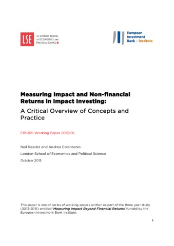 Impact Investing is a form of investment that has risen to prominence in recent years. Compared to other forms of socially responsible investment, the most prominent feature of impact investing is its focus on measuring the social and environmental return that it generates. In response, much effort has been undertaken to develop effective measurement systems, but confusion remains around the notions of ‘non-financial return’ and ‘impact’, and their assessment in practice. Thus this paper provides a preliminary overview of those underlying concepts, drawing especially on the perspective of impact investing literature. Further, it begins to cast a critical eye on the roles and responsibilities within measurement, making more explicit the subjective interpretation of social and environmental return (SER) by investors, and the clash of concepts taken from other older measurement traditions. In doing so, the paper investigates some of the tensions around breadth of coverage; participation and objectivity; attribution of impact; rigour and flexibility, and the very concept of ‘a return’ itself. Within this context, the paper shows that the sector does not yet appear to have found a pragmatic, participative, systematic way forward, and concludes with the identification of key research areas that need to be addressed to advance knowledge. Further empirical data collection and analysis will be undertaken for papers to be published in a subsequent series.
