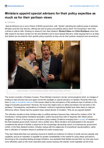 Special Advisers are a now a fixture of British government, with “SpAds” patrolling the political space in between Ministers and the Civil Service, offering the kind of policy and political advice which “Sir Humphreys” don’t feel inclined or able to offer. Drawing on research from New Zealand, Richard Shaw and Chris Eichbaum show that little research has been carried out into why Ministers opt to have Special Advisers, while arguing that it is as likely that SpAds are recruited for their specific policy expertise as they are for their partisan viewpoint and connections.