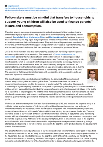 There is a growing consensus among academics and policymakers that interventions in early childhood to improve cognitive skills help to boost those made later during adolescence. In new research, Daniela Del Boca, Christopher Flinn, and Matthew Wiswall find evidence to support these interventions, but they argue that policymakers need to understand that households do not act solely to maximize their child’s development. They write that while government transfers of money and goods to households to support young children will be used to support them, they may also be used by parents to finance their own purchases of consumption goods and leisure.