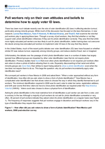 There has been much debate recently over the role of voter identification (ID) laws in affecting election turnout, particularly among minority groups. While much of the discussion has focused on the laws themselves, in new research, Lonna Rae Atkeson, Yann P. Kerevel, R. Michael Alvarez, and Thad E. Hall examine the role that poll workers play in applying these laws. Through a survey of poll workers, they find that whether or not they support voter photo identification influences if they ask for photo identification correctly. They also find that while more highly educated poll workers are less likely to ask for photo identification, better training does not overcome the desire among less educated poll workers to implement voter ID laws in the way that they desire.
