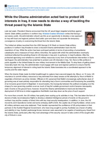 Late last week, President Obama announced that the US would begin targeted airstrikes against Islamic State artillery positions in northern Iraq. Kristian Coates Ulrichsen writes that facing a war-weary public, the administration should use this as an opportunity to develop a new approach to Iraq with local and regional partners that builds upon and does not squander the temporary convergence of policy in overcoming the threat from the Islamic State.