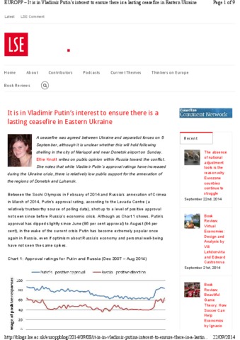 A ceasefire was agreed between Ukraine and separatist forces on 5 September, although it is unclear whether this will hold following shelling in the city of Mariupol and near Donetsk airport on Sunday. Ellie Knott writes on public opinion within Russia toward the conflict. She notes that while Vladimir Putin’s approval ratings have increased during the Ukraine crisis, there is relatively low public support for the annexation of the regions of Donetsk and Luhansk.