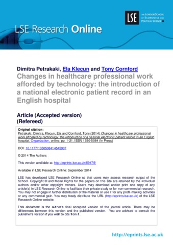 This article considers changes in healthcare professional work afforded by technology. It uses the sociology of professionals’ literature together with a theory of affordances to examine how and when technology allows change in healthcare professional work. The study draws from research into the introduction of a national electronic patient record in an English hospital. We argue that electronic patient record affords changes through its materiality as it interacts with healthcare professional practice. Its affordances entail some level of standardisation of healthcare professional conduct and practice, curtailment of professional autonomy, enlargement of nurses’ roles and redistribution of clinical work within and across professional boundaries. The article makes a contribution to the growing literature advocating a cultural approach to the study of technological affordances in organisations and to studies that explore healthcare professional practice in conjunction with the materiality of technology. Two main lines of argument are developed here. First, that technological affordances do not solely lie with the materiality of technology nor with individual perceptions, but are cultivated and nurtured within a broader cultural–institutional context, in our case a professional context of use. Second, that technological affordance of change is realised when healthcare professionals’ (individual and collective) perceptions of technology (and of its materiality) fit with their sense of (professional) self. In this respect, the article shows the extent to which the materiality of technology plays out with professional identity and frames the level and extent to which technology can and cannot afford restructuring of work and redistribution of power across professional groups.