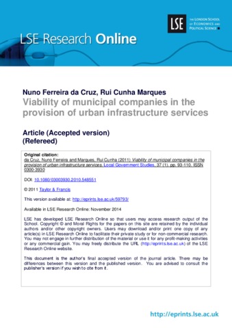 This article discusses the organisational and institutional model of municipal company in the provision of urban infrastructure services in Portugal. The law recently enacted which defined the legal regime for the local business sector, as well as the growing awareness that the new public management models represent great advantages in comparison with the bureaucratic ones that characterise the traditional public administration, make this a current and relevant issue. For the purpose of investigating the viability of this provision model, this research encompasses three complementary analyses. First, the results obtained from a nationwide questionnaire on the features of municipal companies are analysed. Second, a SWOT matrix is constructed to examine the model of municipal company and, third, the total factor productivity (TFP) of these organisations is determined using the index number theory, in order to evaluate their performance and compare it with that of the traditional bureaucratic models. Although the concept of municipal company is based on noble principles and, in theory, it shows advantages compared to other means of service provision, this research points to very negative results regarding the model and leads to the conclusion that the aimed benefits are not achieved in Portugal. There are many causes contributing to this effect, but the political patronage of these companies and the lack of technical competence are presumably two of the most significant ones.