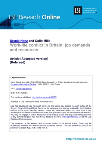 This article examines the influence of job demands and job-related resources on the experience of two dimensions of work-life conflict (WLC) in Britain. Theory suggests that higher levels of resources should reduce WLC but empirical analyses often fail to find this effect. We address the issue by examining the impact of a wide range of resources as well as their interactions with job demands. Analyses of the Working in Britain 2000 survey suggest that job resources and demands affect WLC through different processes, which differ for the two types of WLC. They fail to find evidence that job resources dampen the effects of job demands on WLC. They also document that many effects of job characteristics depend on context or vary by gender, for example, the effects of job pressure and job autonomy.