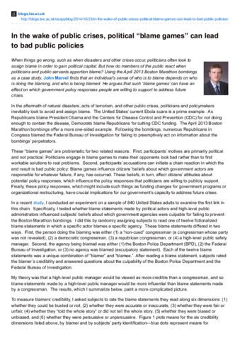 When things go wrong, such as when disasters and other crises occur, politicians often look to assign blame in order to gain political capital. But how do members of the public react when politicians and public servants apportion blame? Using the April 2013 Boston Marathon bombings as a case study, John Marvel finds that an individual’s sense of who is to blame depends on who is doing the blaming, and who is being blamed. He argues that such ‘blame games’ can have an effect on which government policy responses people are willing to support to address future crises.