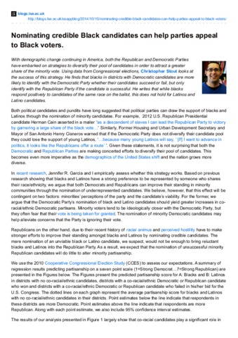 With demographic change continuing in America, both the Republican and Democratic Parties have embarked on strategies to diversify their pool of candidates in order to attract a greater share of the minority vote. Using data from Congressional elections, Christopher Stout looks at the success of this strategy. He finds that blacks in districts with Democratic candidates are more likely to identify with the Democratic Party whether their candidates succeed or fail, but only identify with the Republican Party if the candidate is successful. He writes that while blacks respond positively