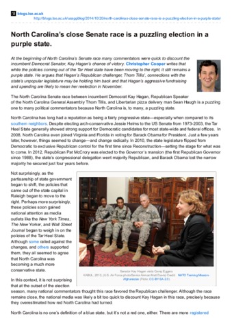 At the beginning of North Carolina’s Senate race many commentators were quick to discount the incumbent Democrat Senator, Kay Hagan’s chance of victory. Christopher Cooper writes that while the policies coming out of the Tar Heel state have been moving to the right, it still remains a purple state. He argues that Hagan’s Republican challenger, Thom Tillis’, connections with the state’s unpopular legislature may be holding him back and that Hagan’s aggressive fundraising and spending are likely to mean her reelection in November.