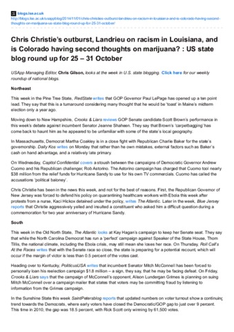 Chris Christie’s outburst, Landrieu on racism in Louisiana, and is Colorado having second thoughts on marijuana? : US state blog round up for 25 – 31 October.