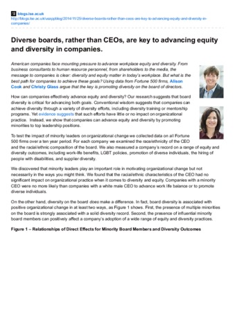 American companies face mounting pressure to advance workplace equity and diversity. From business consultants to human resource personnel, from shareholders to the media, the message to companies is clear: diversity and equity matter in today’s workplace. But what is the best path for companies to achieve these goals? Using data from Fortune 500 firms, Alison Cook and Christy Glass argue that the key is promoting diversity on the board of directors.