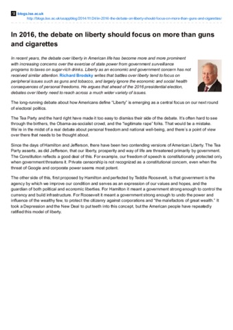 In recent years, the debate over liberty in American life has become more and more prominent with increasing concerns over the exercise of state power from government surveillance programs to taxes on sugar-rich drinks. Liberty as an economic and government concern has not received similar attention. Richard Brodsky writes that battles over liberty tend to focus on peripheral issues such as guns and tobacco, and largely ignore the economic and social health consequences of personal freedoms. He argues that ahead of the 2016 presidential election, debates over liberty need to reach across a much wider variety of issues.